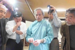 切開と縫合の基本を指導中の斎藤教授