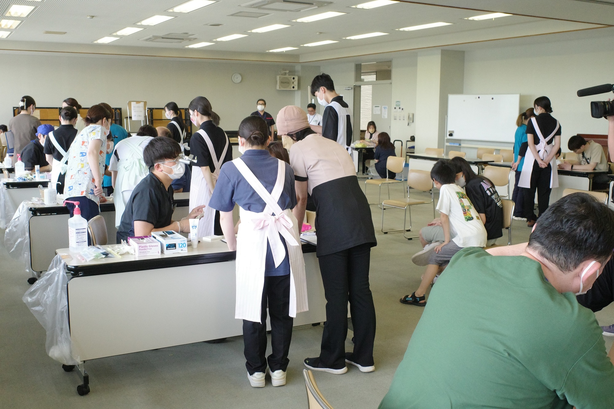 開場後、歯科医師による口腔内診査とフッ素塗布が行われ、歯の模型作りコーナーでは「歯医者さんのにおいがする~」「えっ、キーホルダーにできるの?」と歯科用材料を使用し歯型作成を楽しむ様子がみられました。位相差顕微鏡コーナーではモニター越しに口腔内細菌をみて熱心に説明を聞いている方や、歯科訪問診療器材コーナーでは器材や歯科訪問診療について質問がありました。歯科医院の受診経験のない小さなお子さんの予行演習として来場した保護者もおり、市民の来場目的も多様化しているように感じました。また山形歯科専門学校の学生は慣れないながらも熱心に歯式を記録する姿が見られました。今年の来場者は54人と昨年の52名と同程度でしたが、学生の参加といった新たな取り組みがあり来年度も充実した事業となることが期待されます。