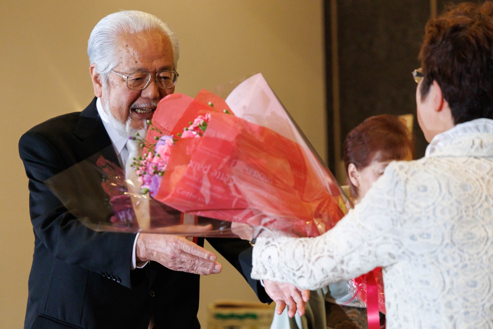 令和7年11月2日(日)午前11時30分より「ロイヤルパインズホテル米沢」において伊藤脩先生旭日双光章受章記念祝賀会が開催されました。大峽潤米歯専務理事が司会を務め、安藤栄吾米歯副会長より開会の挨拶があり、渡部宏一米歯会長より発起人挨拶、土門宏樹形歯会長、成原雅道日本大学歯学部・松戸歯学部同窓会山形県支部支部長より祝辞がありました。祝電披露の後、渡部米歯会長、成原日大松戸歯学部同窓会山形県支部支部長、米歯太鼓愛好会の長谷部雅之君、置賜地区野球チームコーチ陣の松岡勲キャプテン、長井地区歯科医師会の赤間尚子先生より記念品贈呈、続いて遠藤浩米歯相談役と赤間先生、形歯事務局の前沢由佳さんと杉本栄子さんより花束贈呈がありました。受章者謝辞では伊藤脩先生より「春の叙勲において思いもかけず受章となりました。長年の積み重ねですが、このような章をいただき感激しています。ひとえに皆様、そして諸先輩のご指導とご鞭撻の賜物であり、特に日々支えてくれた妻の裕子に深く感謝しています。今後も微力ながら地域医療に貢献する決意を新たに、今後とも変わらぬお付き合いを賜りますようお願い申し上げます。」と述べました。その後、五十嵐栄君が所属する米沢金剛会による祝謡があり、続いて米歯太鼓愛好会の法被を着用して鏡開きが行われ、髙橋義夫酒田地区歯科医師会顧問より乾杯の発声で祝宴が始まりました。